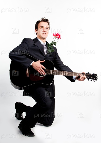 Молодой симпатичный мужчина в темном деловом костюме поет и играет на гитаре