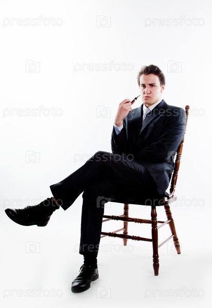 Портрет молодого симпатичного мужчины в темном строгом костюме с курительной трубкой в руке
