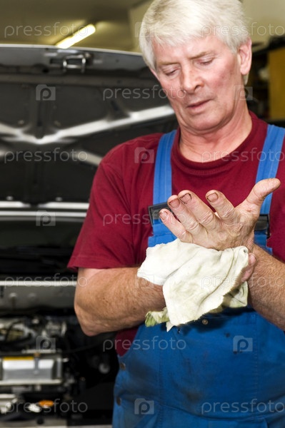 Автомеханик вытирает руки после ремонта автомобиля