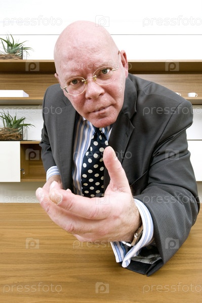 Пожилой начальник наклоняется вперед и протягивает руку, глядя пронизывающим взглядом