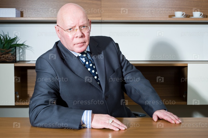 Строгий пожилой начальник позирует в современном офисе, наклонясь на стол