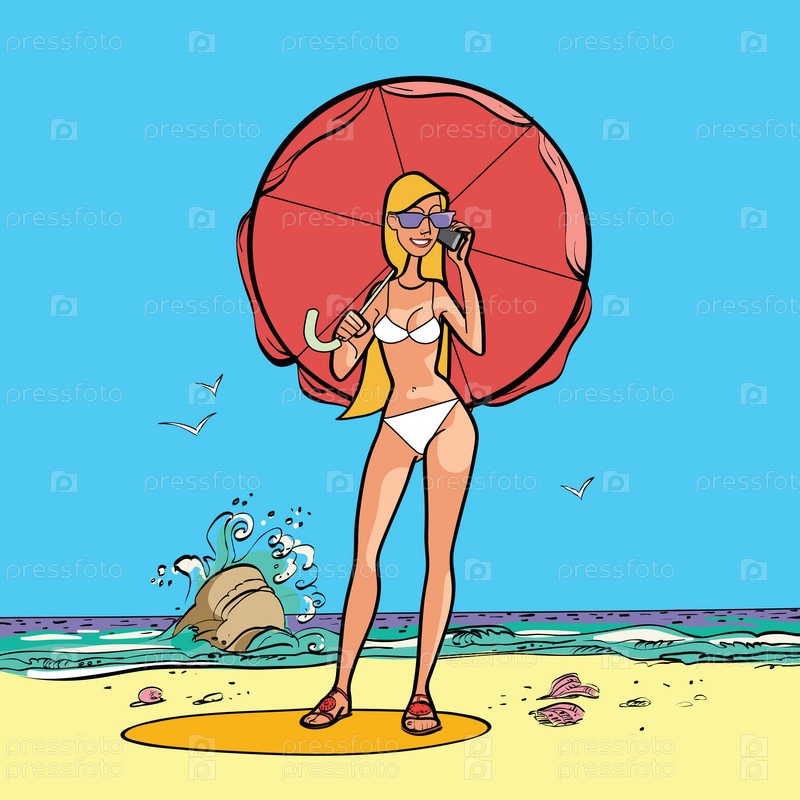 Девушка в купальнике на берегу моря с зонтиком