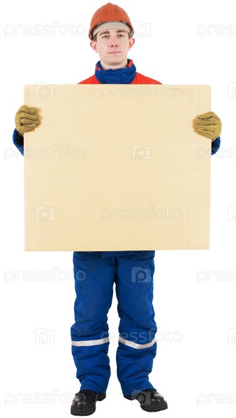 Работник на шлеме с коробкой на белом фоне