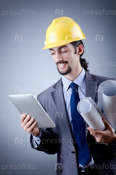 Архитектор с планшетным компьютером и чертежами в руках