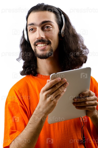 Молодой человек слушает музыку на планшетном компьютере