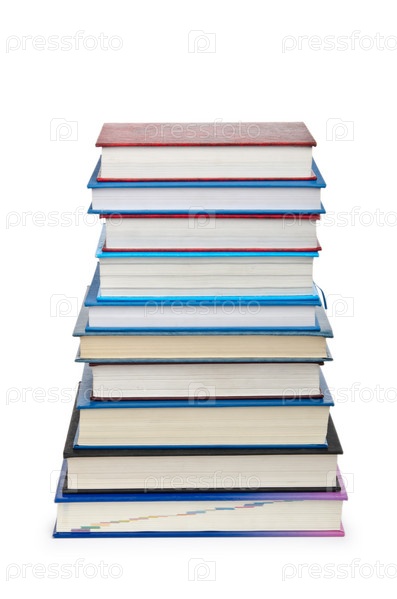 Высокая стопка книг, изолированная на белом фоне