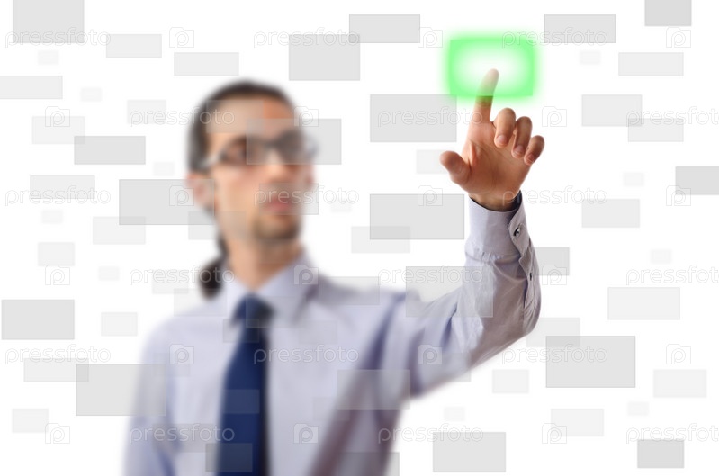 Бизнесмен нажимает на виртуальную кнопку
