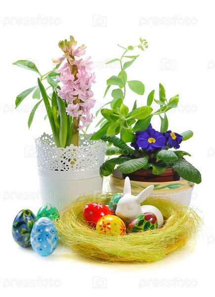 Пасхальные яйца с весенними цветами на белом фоне