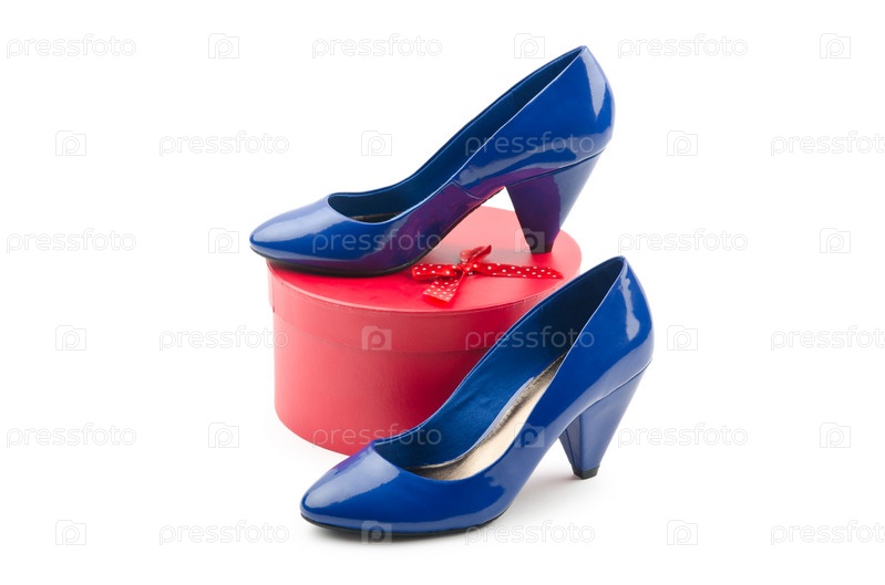 Пара синих женских туфель на красной коробке на белом фоне