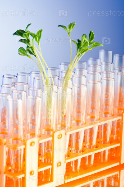 Зеленые саженцы в пробирках в лаборатории