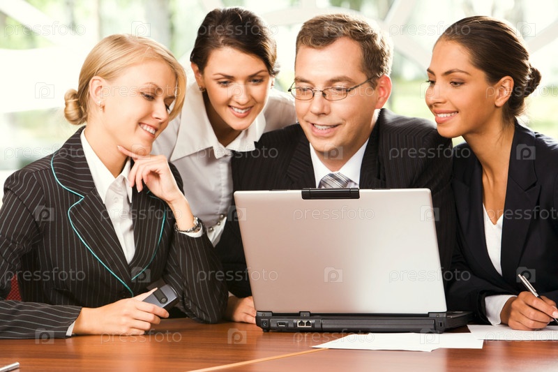 Портрет четырех бизнесменов, сидящих за столом перед открытым ноутбуком и серьезно смотрящих на экран