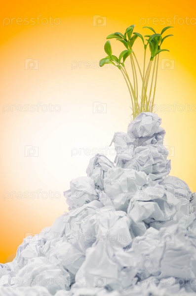 Зеленый саженец, растущий из комков макулатуры