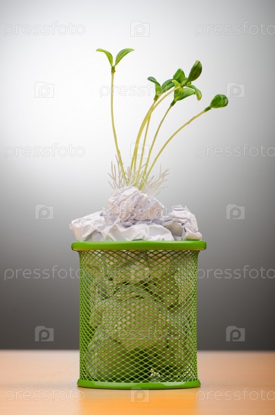 Зеленый саженец, растущий из комков бумаги в мусорной корзине