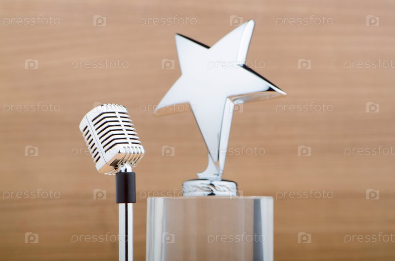 Студийный микрофон и премия в виде звезды на деревянном фоне