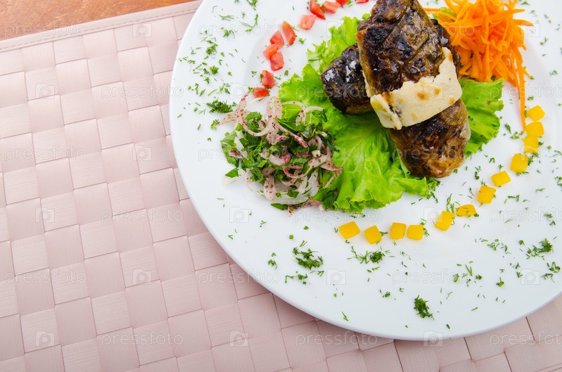 Жареное мясо с овощами на тарелке