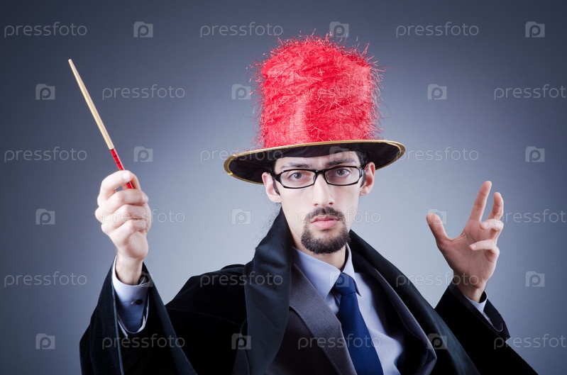 Деловой мужчина в шляпе фокусника с волшебной палочкой на сером фоне