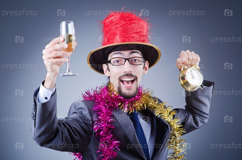 Деловой мужчина в новогодней мишуре с бокалом шампанского и будильником на сером фоне