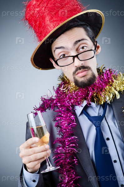 Деловой мужчина в новогодней мишуре с бокалом шампанского на сером фоне