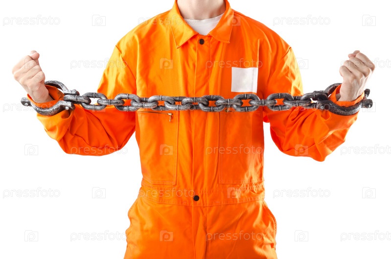 Заключенный человек в оранжевой одежде с цепями на руках на белом фоне