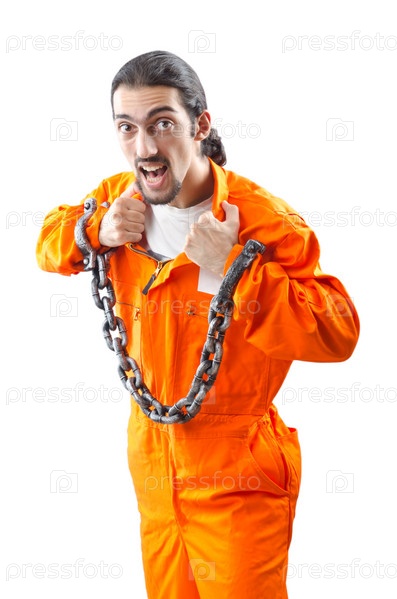 Осужденный преступник с цепями на руках на белом фоне