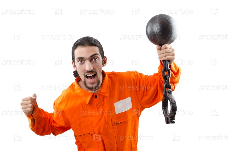 Освобожденный из тюрьмы преступник с кандалами на белом фоне