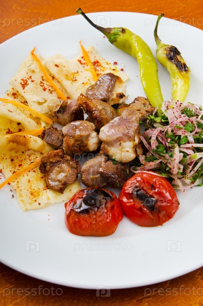 Жареное мясо с овощами на тарелке