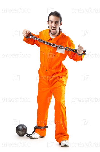 Осужденный преступник в кандалах на белом фоне