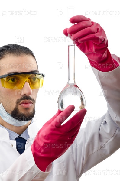 Работник лаборатории держит колбу с жидкостью на белом фоне