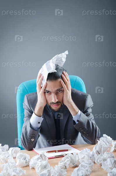 Бизнесмен, сидящий за столом с кучей мусора