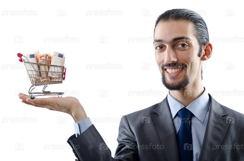 Бизнесмен держит в руке тележку с деньгами на белом фоне