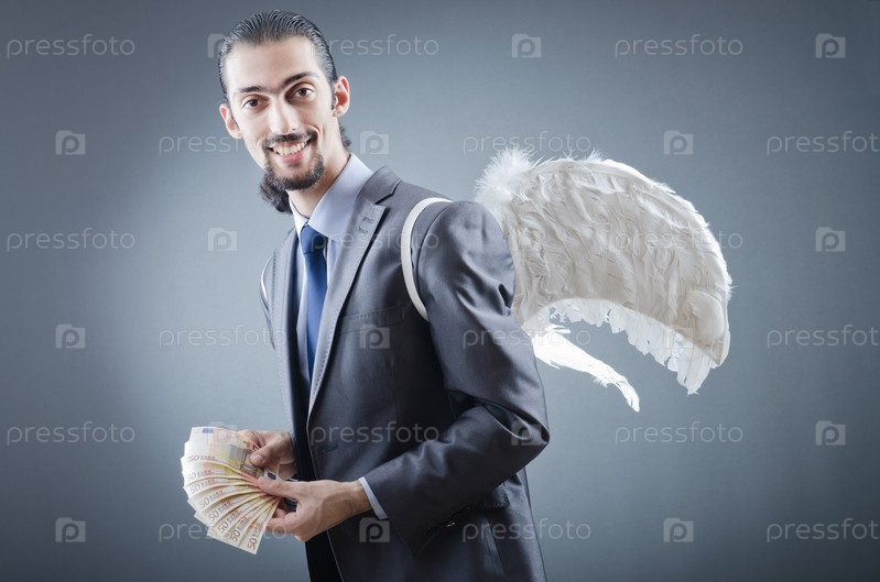Бизнесмен с ангельскими крыльями и с деньгами на сером фоне