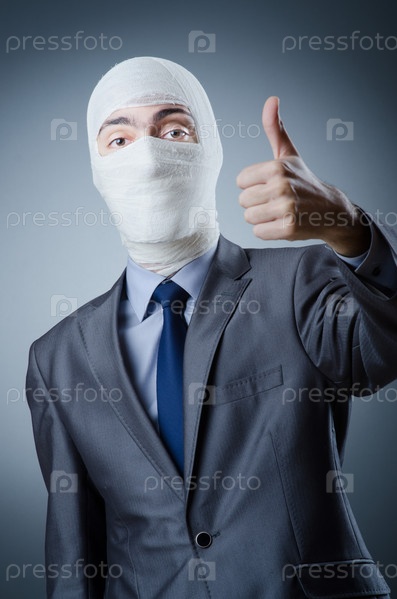 Человек в медицинской повязке показывает большой палец на сером фоне