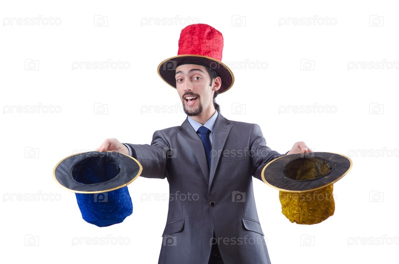 Мужчина с красочными шляпами на белом фоне