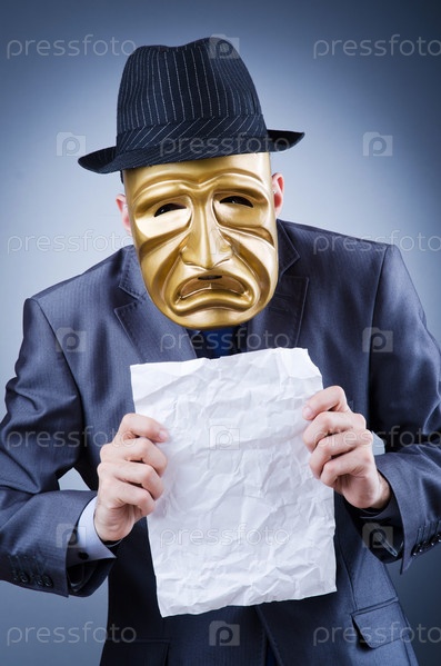 Предприниматель в золотой маске держит мятый белый лист бумаги