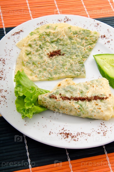 Блины, огурец и зеленый салат на тарелке