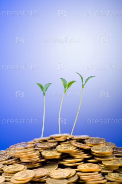 Финансовая концепция с зелеными ростками из кучи монет