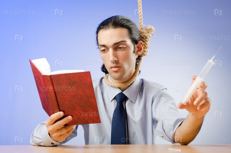 Мужчина с петлей на шее читает Библию и держит шприц в руке