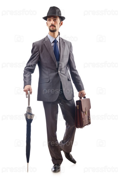 Бизнесмен с зонтиком на белом фоне