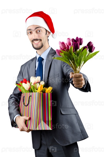 Предприниматель с букетами тюльпанов в колпаке Санта Клауса