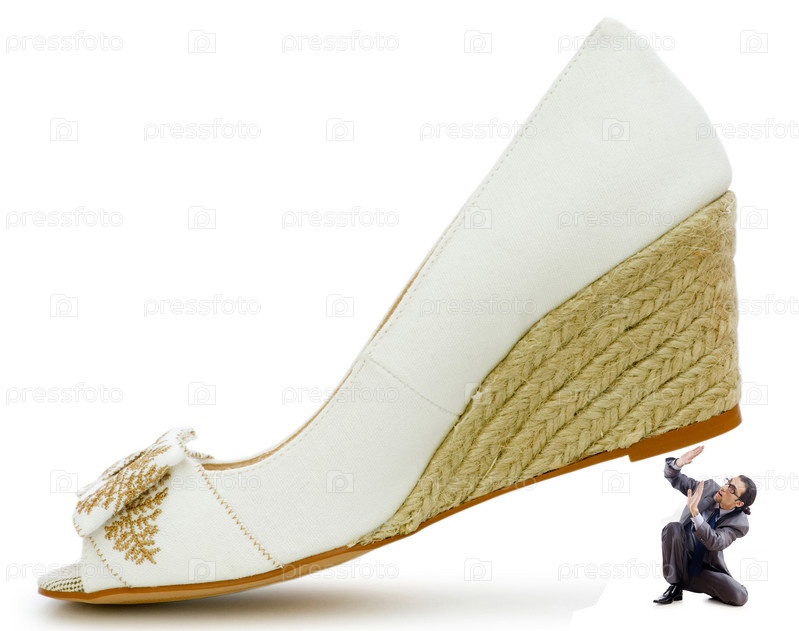 Крупная женская туфля и мелкий мужчина под ней на белом фоне