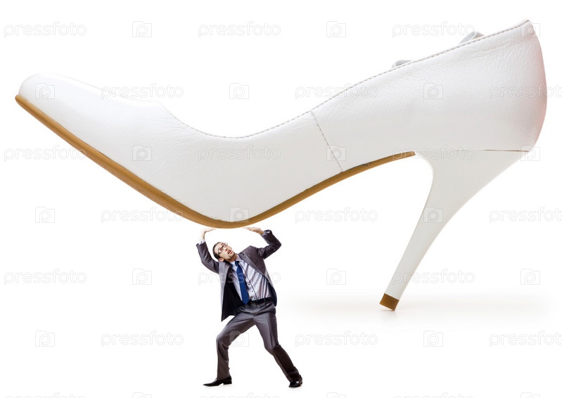 Крупная женская туфля и мелкий мужчина под ней на белом фоне