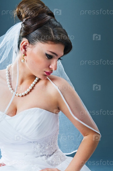 Невеста в свадебном платье на синем фоне