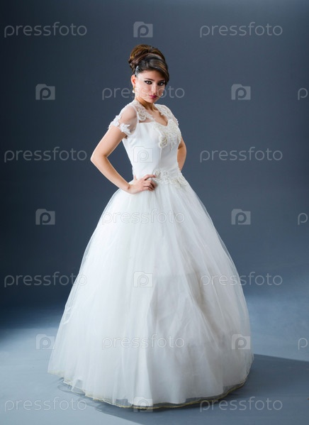Невеста в свадебном платье на сером фоне