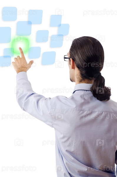 Бизнесмен нажимает на виртуальную кнопку