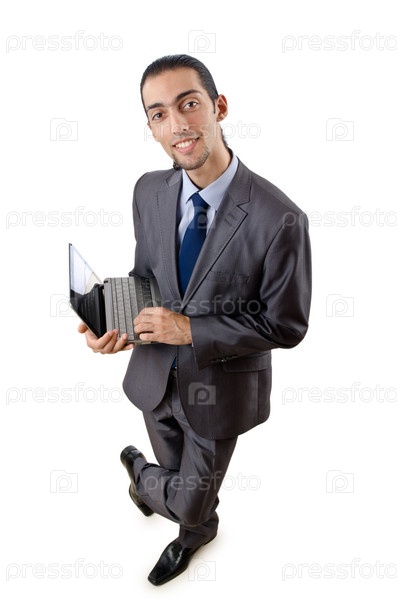 Бизнесмен с ноутбуком на белом фоне