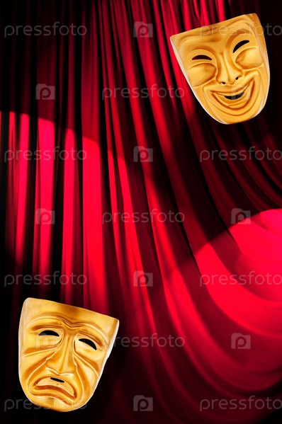 Две золотые маски на фоне красного занавеса