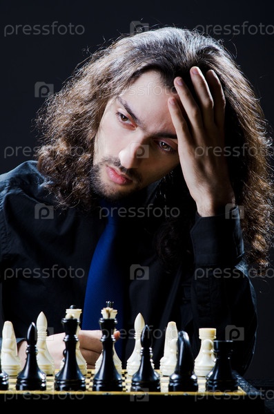 Молодой человек сидит перед шахматной доской с расставленными фигурами на черном фоне