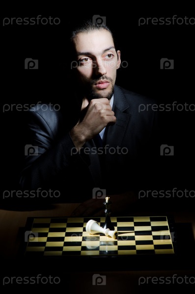 Мужчина играет в шахматы на черном фоне