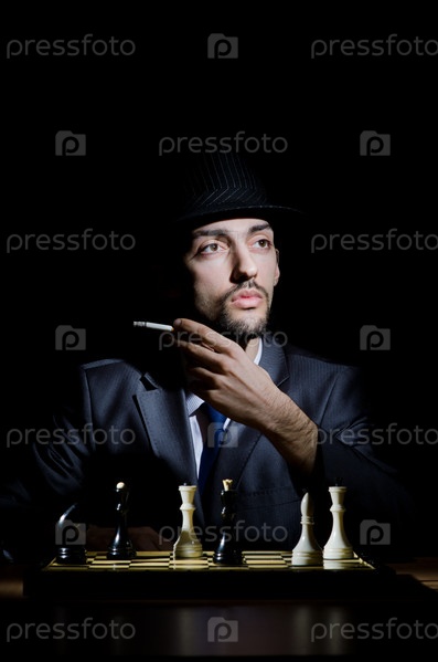 Курящий мужчина играет в шахматы на черном фоне