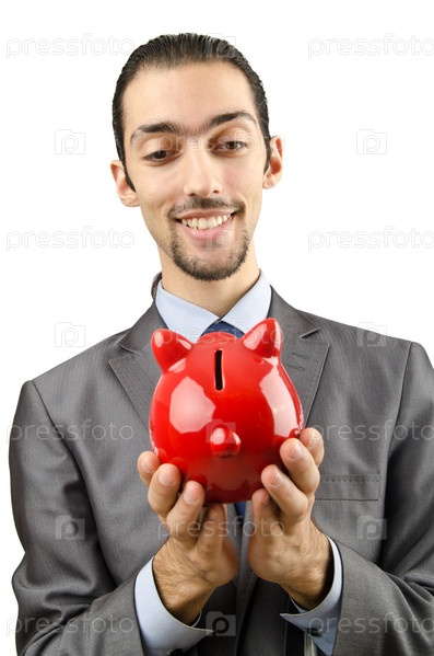 Деловой мужчина со свиньей-копилкой на белом фоне